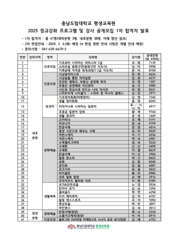 [충남도립대학교 평생교육원]2025 정규강좌 프로그램 및 강사 공개모집 1차 합격자(서류심사) 발표