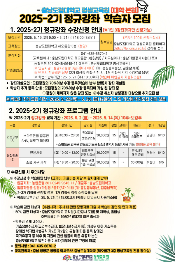 - 수강신청기간 : 25. 5. 19.(월) ~  5. 21.(수) 09:00 ~ 18:00 (3일간)