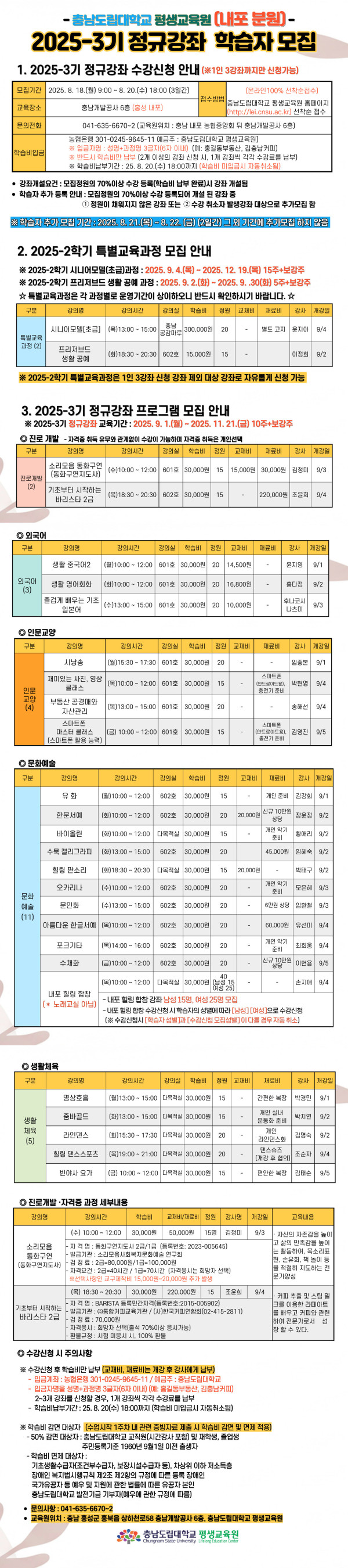 충남도립대학교 평생교육원  2025-3기 정규강좌 학습자 모집 안내 입니다.