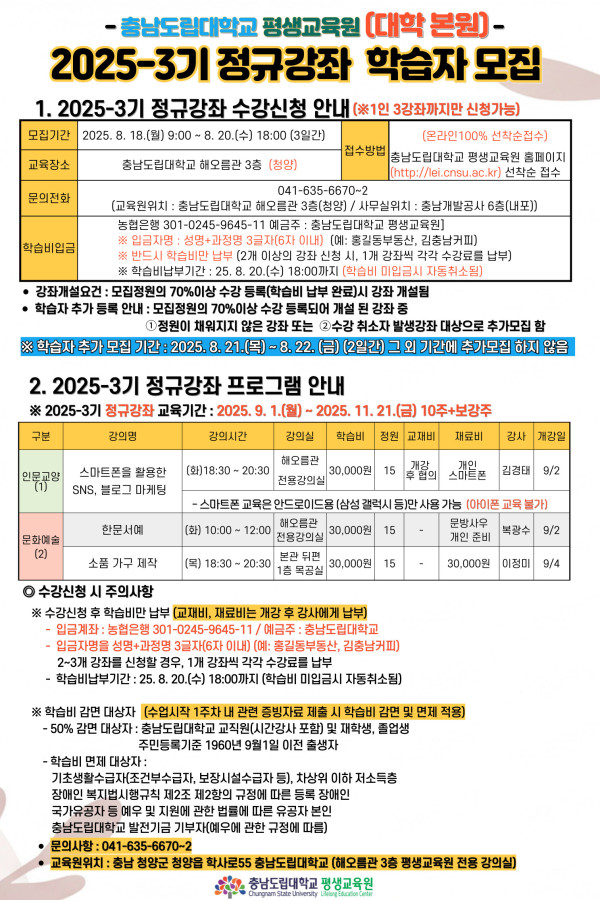 충남도립대학교 평생교육원  2025-3기 정규강좌 학습자 모집 안내 입니다.