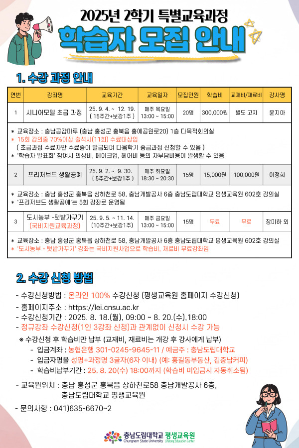 충남도립대학교 평생교육원 홈페이지(이하 "홈페이지")는 충남도립대학교 평생교육원 (이하 '학교')와 홈페이지 이용자(이하 "이용자")가 홈페이지 서비스 약관 (이하 "약관" 승낙하는 것을 조건으로 하여 홈페이지 서비스를 제공한다. 약관은 통지 없이 수시로 갱신될 수 있으며, 이용자는 어제든지 홈페이지의 약관 페이지를 이용하여 최신 버전의 약관을 확인할 수 있다.