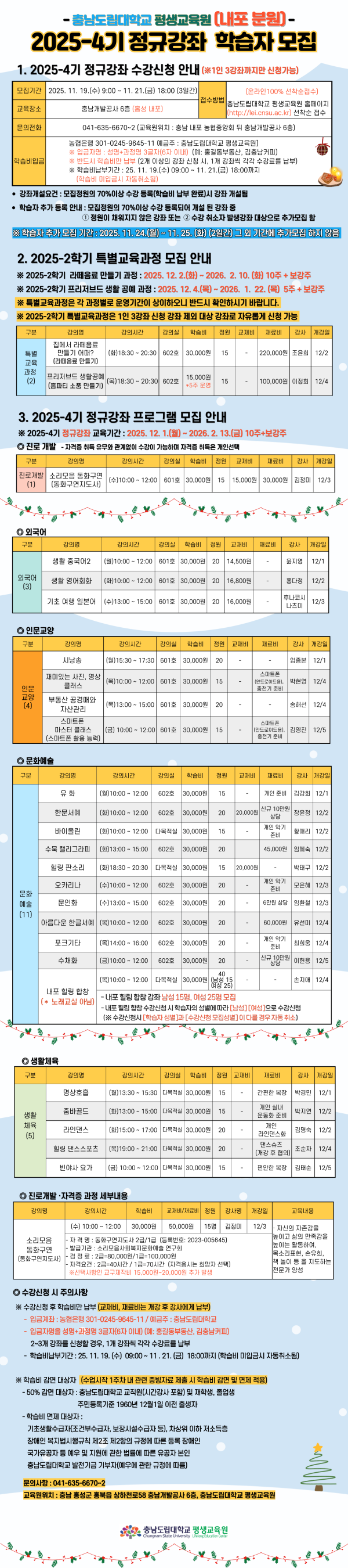 [충남도립대학교평생교육원]2025년 4기 및 특별교육과정 정규강좌(내포 분원) 학습자모집 안내