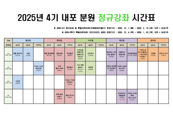 모집정원의 70%이상 등록완료된 강좌의 경우 모집 정원까지 추가모집 함 (추가모집 기간 : 25. 11. 24.() ~ 11. 25.())