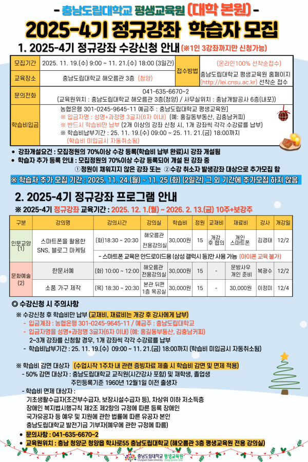 [충남도립대학교평생교육원]2025년 4기 정규강좌(대학 본원) 학습자모집 안내