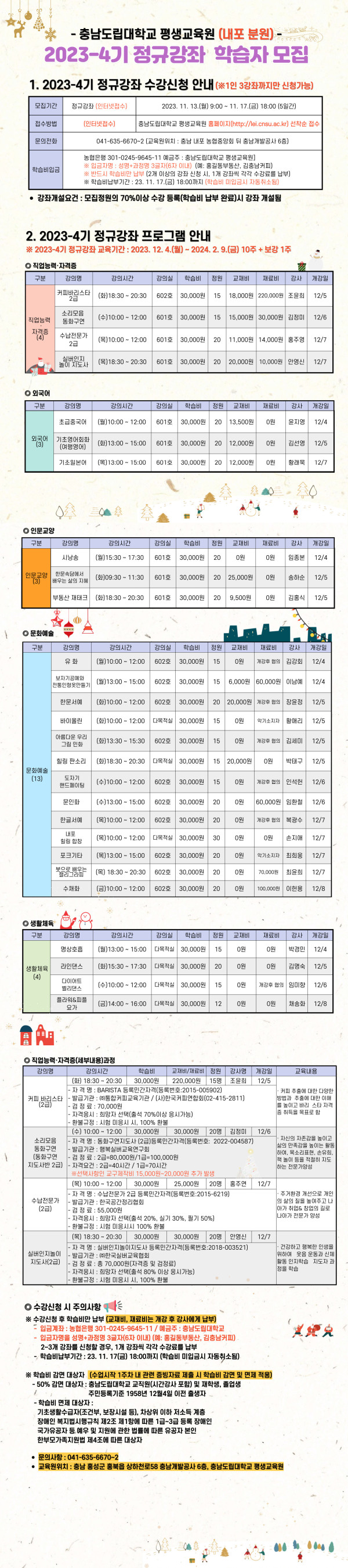 1. 수강신청 기간 : 23. 11. 13.(월) ~ 11. 17.(금), 9:00 ~ 18:00