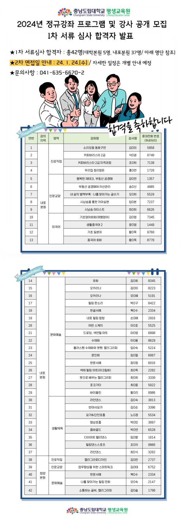 [충남도립대학교 평생교육원] 2024 정규강좌 프로그램 및 강사 공개모집 1차 서류심사 합격자 명단 안내