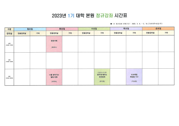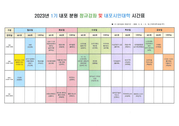 2023-1기 정규강좌 및 내포시민대학 교육과정 시간표 (내포분원, 대학본원)