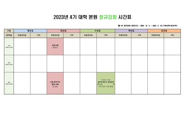 2023-4기 정규강좌 시간표 안내해드립니다.