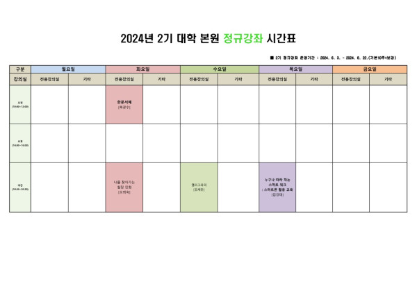 - 2기 정규강좌 개강일 : 2024. 6. 3.(월) / 6. 6.(목)은 현충일로 휴무입니다. 목요일 강좌는  6. 13.(목) 개강합니다.