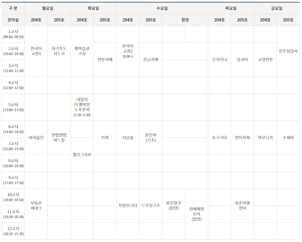 | 강의실 | 204호 | 205호 | 204호 | 205호 | 204호 | 205호 | 청양 | 204호 | 205호 | 204호 | 205호 | |